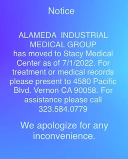 Alameda Industrial Medical Group se ha mudado a Stacy Medical Center a partir del 7/1/2022. Para tratamiento o registros médicos, preséntese en Stacy Medical Center 4580 Pacific Blvd, Vernon CA 90058. Para obtener ayuda, llame al 323.594.0779.